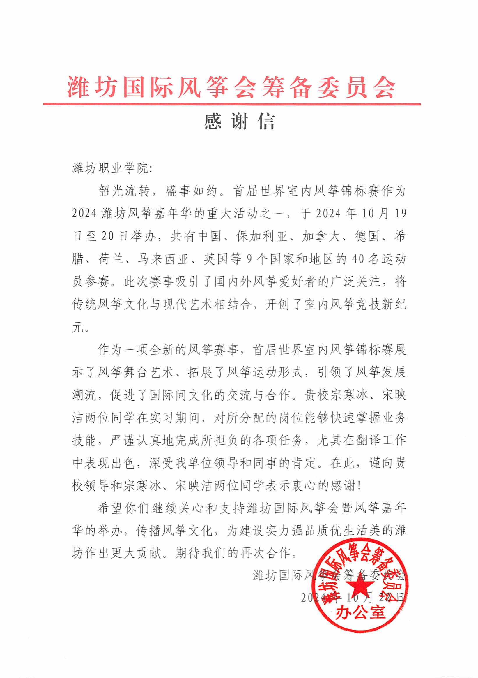 潍坊国际风筝会筹备委员会向必赢发来感谢信