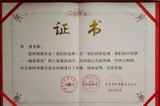 日前,中宣部、教育部、时事报告杂志社为参加全国“我们的价值观、我们的中国梦——精彩课堂”网上展播活动的教师颁发了证书。更多 -