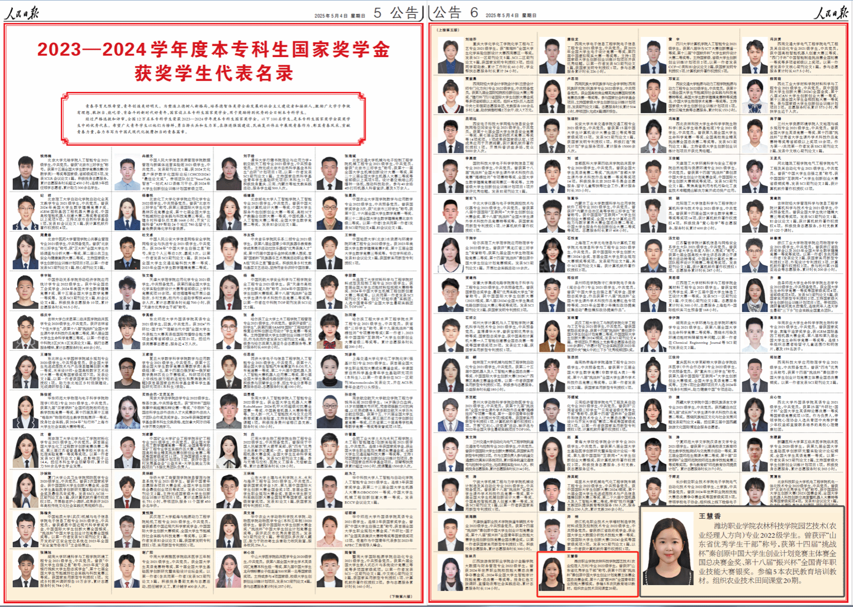 5月4日,《人民日报》(第05、06版)刊登《2023—2024学年度本专科生国家奖学金获奖学生代表名录》,必赢学生王慧香入选名录。《人民日报》国家奖学金获奖学生优秀代表名录是经过严格选拔和评审,从全国12万名优秀国奖获奖本专科学生中选拔出的100名优秀代表。必赢学子脱颖而出,首次荣登《人民日报》国家奖学金获奖学生代表名录,充分展现出必赢学子对崇实尚行、敢于争先潍职精神的生动诠释,同时也反映了学院始终以立德树人为根本任务,...更多 -