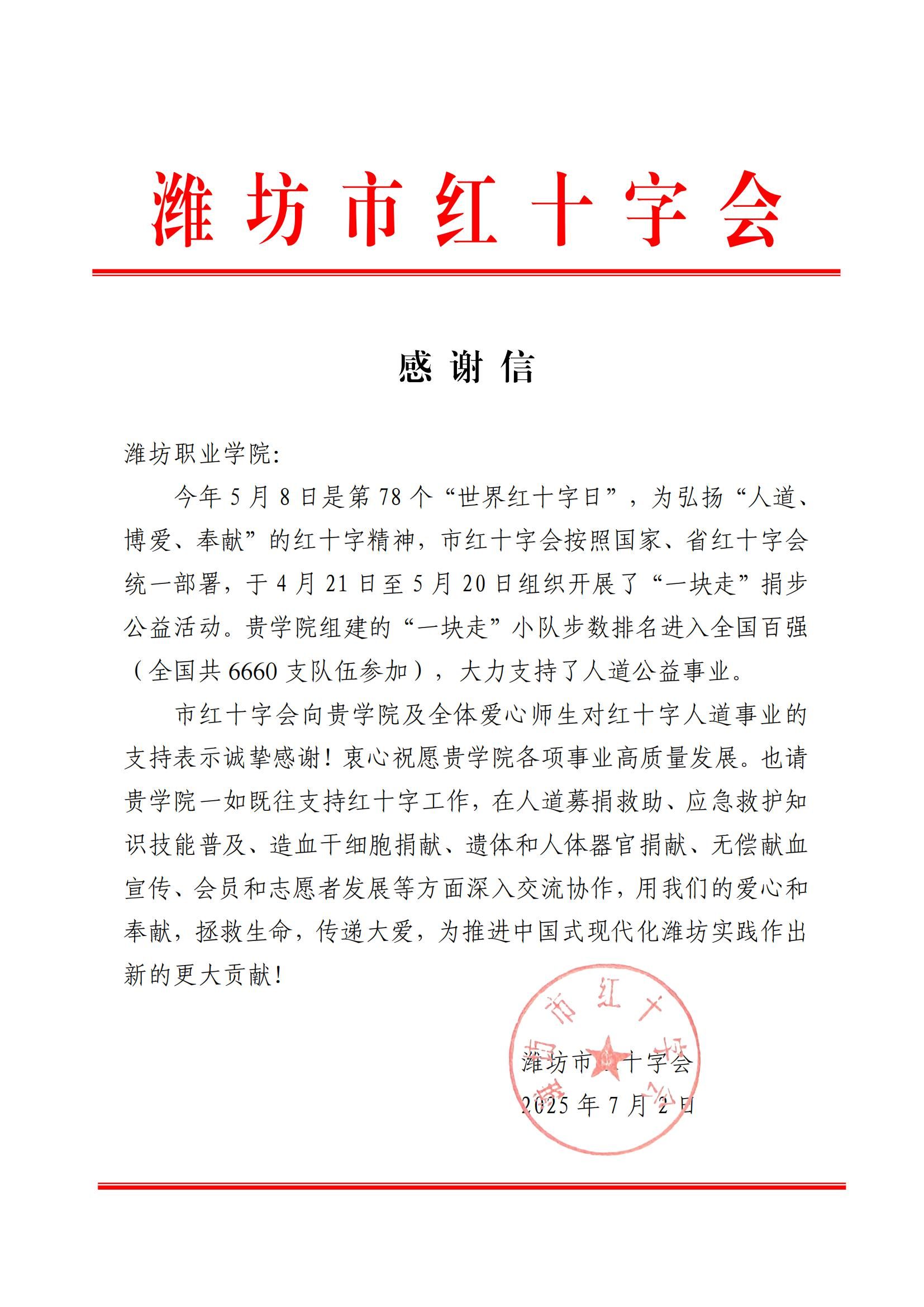 潍坊市红十字会向必赢发来感谢信