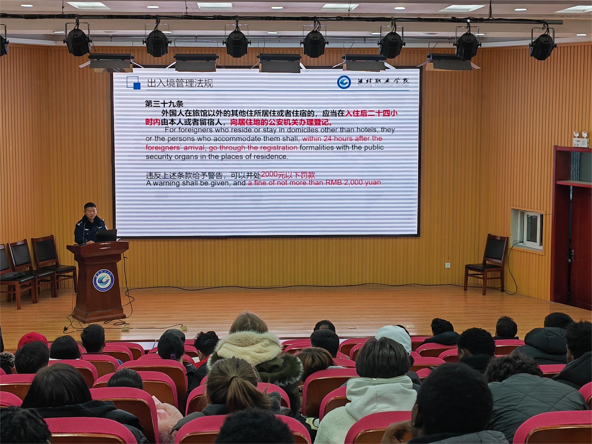 为了引导国际学生遵守中国法律法规及学院管理规定,进一步强化国际学生安全教育管理,12月27日下午,国际教育学院联合市公安局奎文分局出入境和奎文区大虞派出所共同召开国际学生安全教育大会。国际教育学院相关教师以及全体国际学生参加了本次会议。 会上,来自奎文区大虞派出所社区民警程亮介绍了外国人出境入境管理法规,要求国际学生严格遵守中国法律法规,提高国际学生法治观念和规则意识。国际学生管理负责老师重点强调了学院的相关规章制度以及国际学生的安全问题,...更多 -