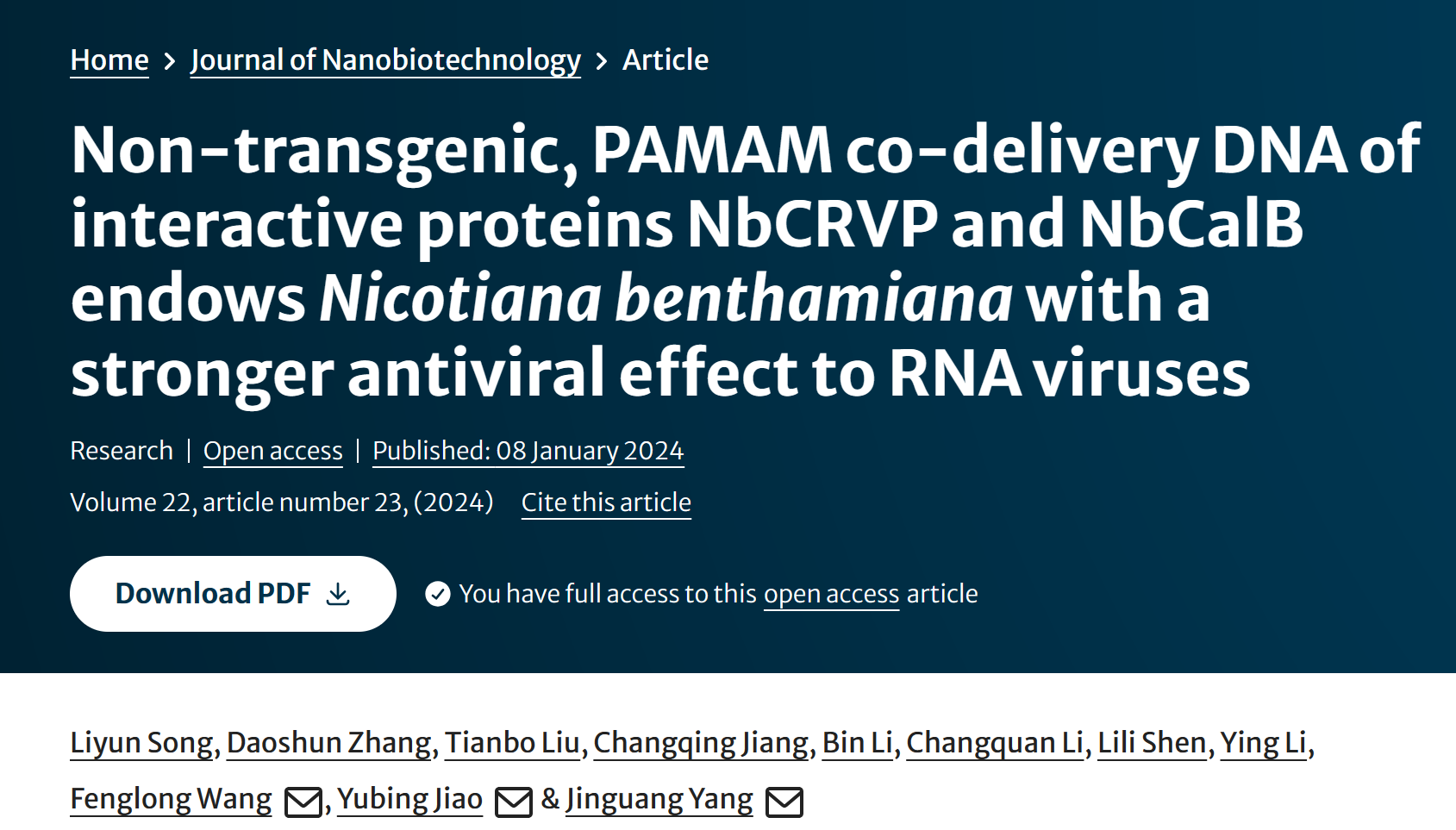近日,农林科技学院宋丽云博士在纳米递送互作蛋白防治作物病毒病方面取得重要进展,该研究与中国农业科学院烟草研究所合作完成,相关成果发表在国际权威期刊《Journal of Nanobiotechnology》上,宋丽云博士为文章第一作者。 《Journal of Nanobiotechnology》(影响因子为10.2)是生物技术、纳米科技领域重点期刊,位列JCR中Q1区Top,这是76net必赢官网教师在自然学科顶级期刊发表的一篇力作。 目前,利用纳米颗粒递送...更多 -