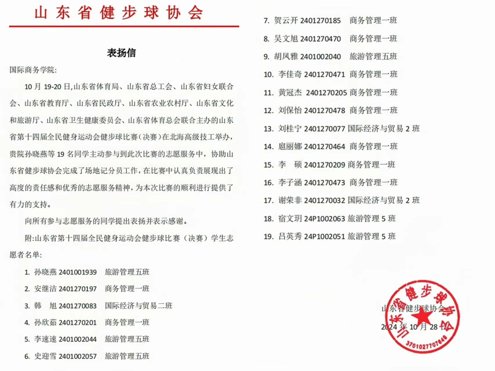 近日,国际商务学院收到来自山东省健步球协会的感谢信,对参与山东省第十四届全民健身运动会健步球比赛决赛志愿服务的19名学生给予高度赞扬和肯定。山东省第十四届全民健身运动会健步球比赛决赛是山东省体育局、山东省教育厅、山东省民政厅等9个部门联合主办的省级赛事,国际商务学院19名学生在此项赛事中承担了场地记分员工作。比赛日当天风雨交加,志愿者们坚守岗位,任劳任怨,以高度的责任心,耐心细致的工作表现为赛事提供了强有力的保障,...更多 -