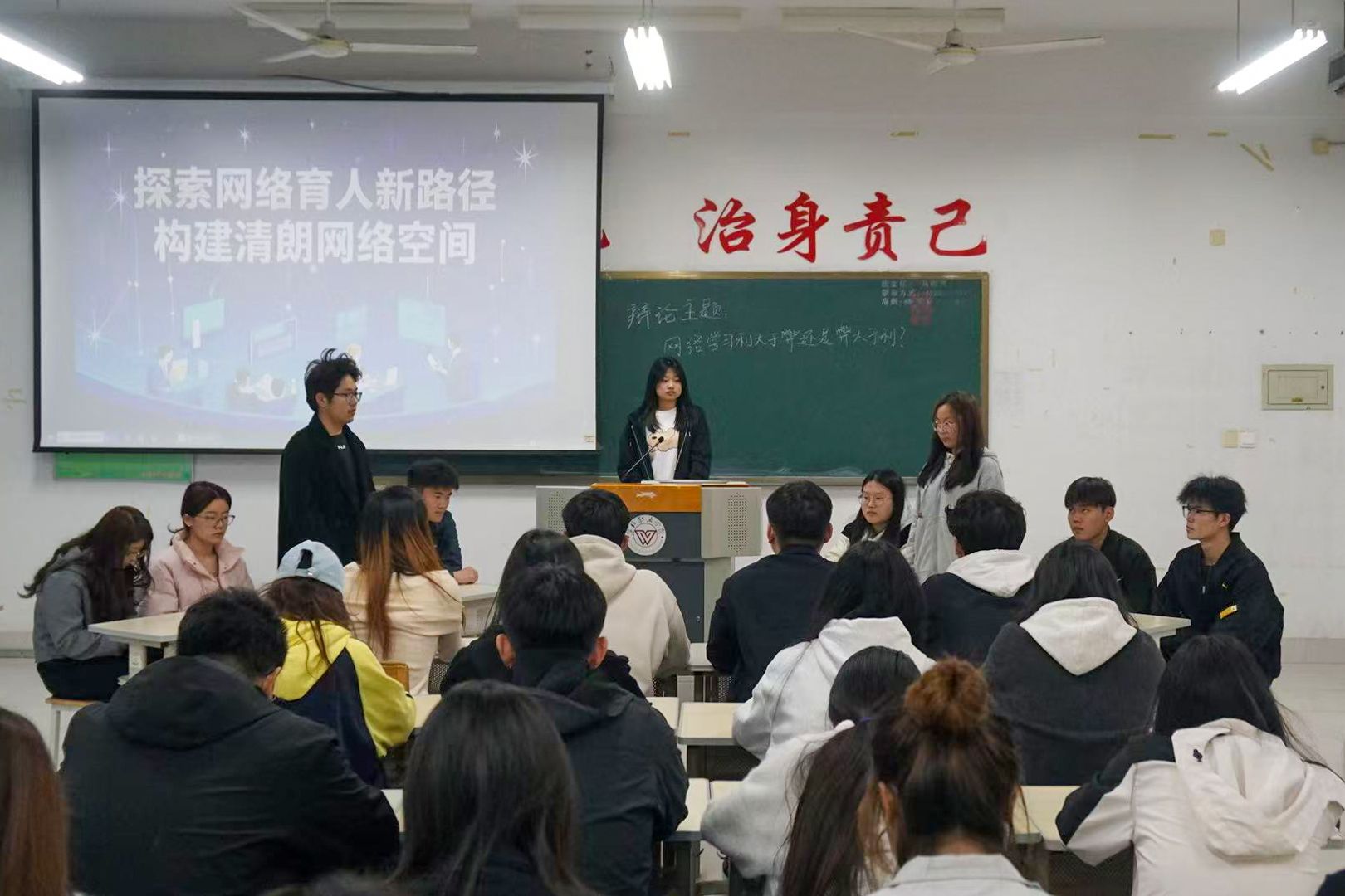 为提升同学们的网络素养与思辨能力,引导学生正确使用网络资源,探索网络思政教育新途径,共同营造清朗网络空间。化学工程学院于4月6日在惠泽1A412举办“探索网络育人新路径,构建清朗网络空间”主题辩论赛。比赛采用4人团队制,4支参赛队伍通过抽签决定正反方立场,围绕“网络学习利大于弊还是弊大于利”展开激烈辩论。比赛设置开篇陈词、攻辩、自由辩论等五个环节。正反双方辩手引经据典、妙语连珠,在思想碰撞中展现了出色的逻辑思维和语言表达能力,...更多