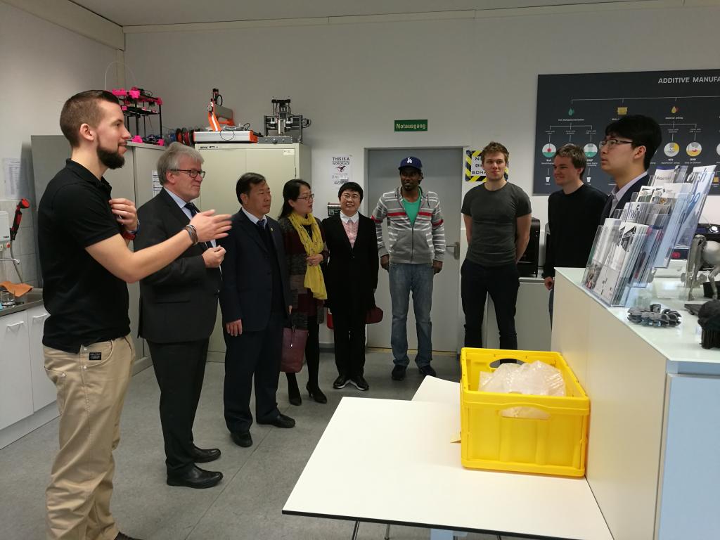 在德国亚琛应用技术大学,学校院长Andreas Gebhardt,副院长Klaus-Peter Kamper与代表团进行了深入交流,双方互相介绍了学校概况、课程设置、国际交流与合作等情况,就双方汽车、机电类相关专业合作进行了深入探讨,在开展合作办学、专业教师培训等方面达成初步意向。代表团一行现场观摩了课堂教学,参观了学生实习实训车间。