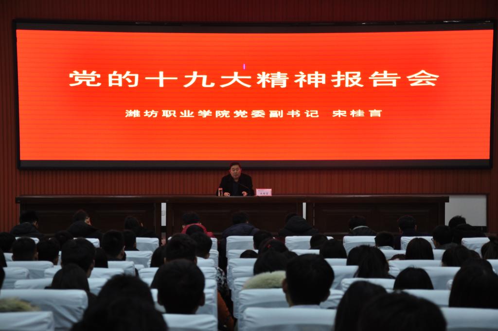 为深入学习宣传贯彻党的十九大精神,进一步推进“立德树人”根本任务,12月4日下午,学院党委副书记宋桂言在滨海校区清泽楼报告厅作了党的十九大精神宣讲报告。团委学生工作处相关人员,学院学生会全体成员,各二级学院(部)学生分会主席,各班团支书聆听了报告。