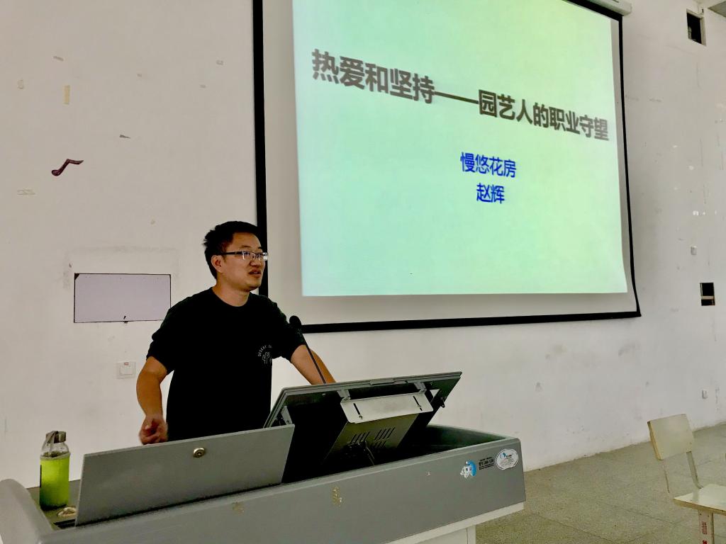 赵辉介绍了公司的情况及发展历史,结合自身创业经历,诠释了一名园艺人在创业中“热爱和坚守”的重要性,引用创业中的典型案例从品行端正热爱园艺、吃苦耐劳踏实肯干、善学好问团队协作、自驱力强承压力好四个方面向同学们全面解读了创业成功与为人、理想与现实、专业与专注、眼光与胆略、执着与坚守之间的相互转化融合渗透,使同学们对将来的就业创业有了更加深刻的认识,为向专业方向发展提供了有益的借鉴和指导。通过对比欧洲市场向同学们介绍了花艺养殖销售的中西方区别,并展示了先进的现代化养殖技术和丰富多彩的花卉品种。