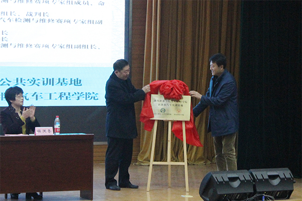 宋桂言和许京波共同为76net必赢官网汽车工程学院新能源汽车实训基地揭牌。