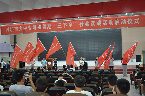 7月12日,2016年潍坊市大中专院校暑期“三下乡”社会实践活动启动仪式在山东科技职业学院举行。必赢农业工程学院“科技之星”社会实践团队和化学工程学院“水资源保护”社会实践服务团队被评为大中专学生暑期“三下乡”社会实践活动市级重点服务团队。潍坊团市委副书记陈珊珊出席并为市级重点团队授旗。