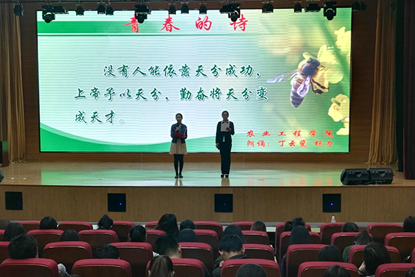 诗会在经营管理学院6名教师和学生带来的《五四礼赞》中拉开帷幕。师生们用饱含激情的声音阐述了对青春的赞美和对祖国的热爱,来自化学工程学院、国际商务学院、农业工程学院、机电工程学院的同学们先后用炽热的深情朗诵了《五四的火炬》、《青春礼赞》、《青春的诗》、《趁父母还在》、《祖国,用青春名义为你歌唱》、《岁寒三友》等经典作品。师生们的精彩朗诵引起了广大观众的共鸣,台下的同学们不时和着台上的朗诵,掀起了一个个高潮。