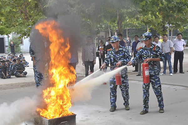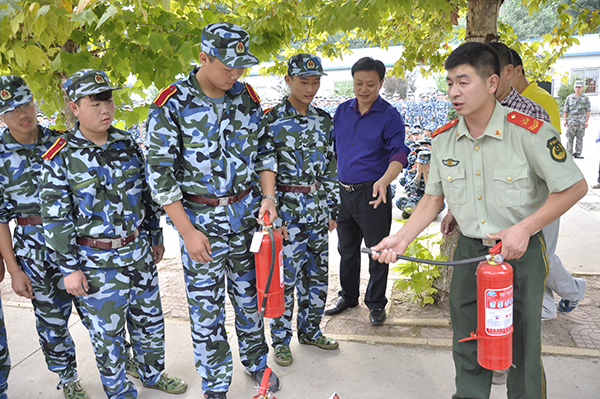 15点整,演习总指挥一声令下,演习正式开始。模拟火险现场,工作人员拉开发烟罐,警报器随之响起,两台消防车迅速进入演习现场,同学们在辅导员(班主任)及宿舍管理人员的指挥下,做着规避动作,向安全地带迅速撤离,到达集结场地整队清点人数并向演习总指挥报告,中专部负责同志对疏散演习进行了点评和总结。整个疏散演习过程时间短、速度快,井然有序,达到预期效果。之后,进行消防灭火演练,奎文区消防大队教官向全体新生讲解了消防知识并对灭火器使用方法进行了演示,部分学生在消防人员的指导下体验使用灭火器。