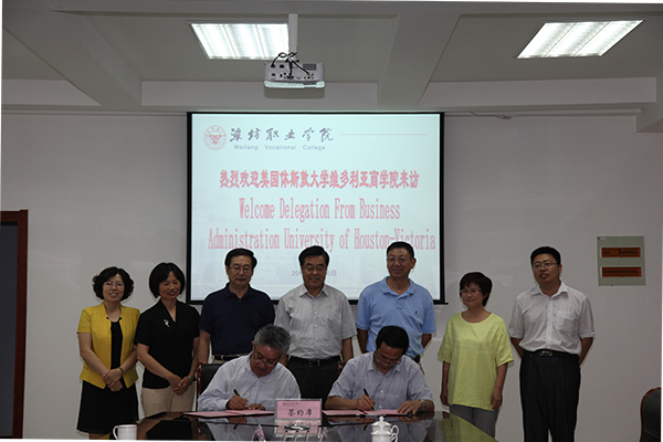 座谈会上,陈仁杰对Farhang Niroomand院长一行来访表示热烈欢迎,向客人介绍了潍坊的概况,并重点介绍了必赢名校建设、自主招生、专业设置及国际交流合作等情况。Farhang Niroomand院长感谢学院的盛情接待,介绍了休斯敦大学的校区设置、维多利亚分校情况、办学理念、师生规模及学科设置等情况。经过座谈交流,双方在校际互访、师生交流、特别是在实质性合作办学项目的拓展等方面进行了深入探讨,达成了初步合作意向。会谈结束后,副院长赵君堂和Farhang Niroomand院长代表双方学校签署了友好合作备忘录。