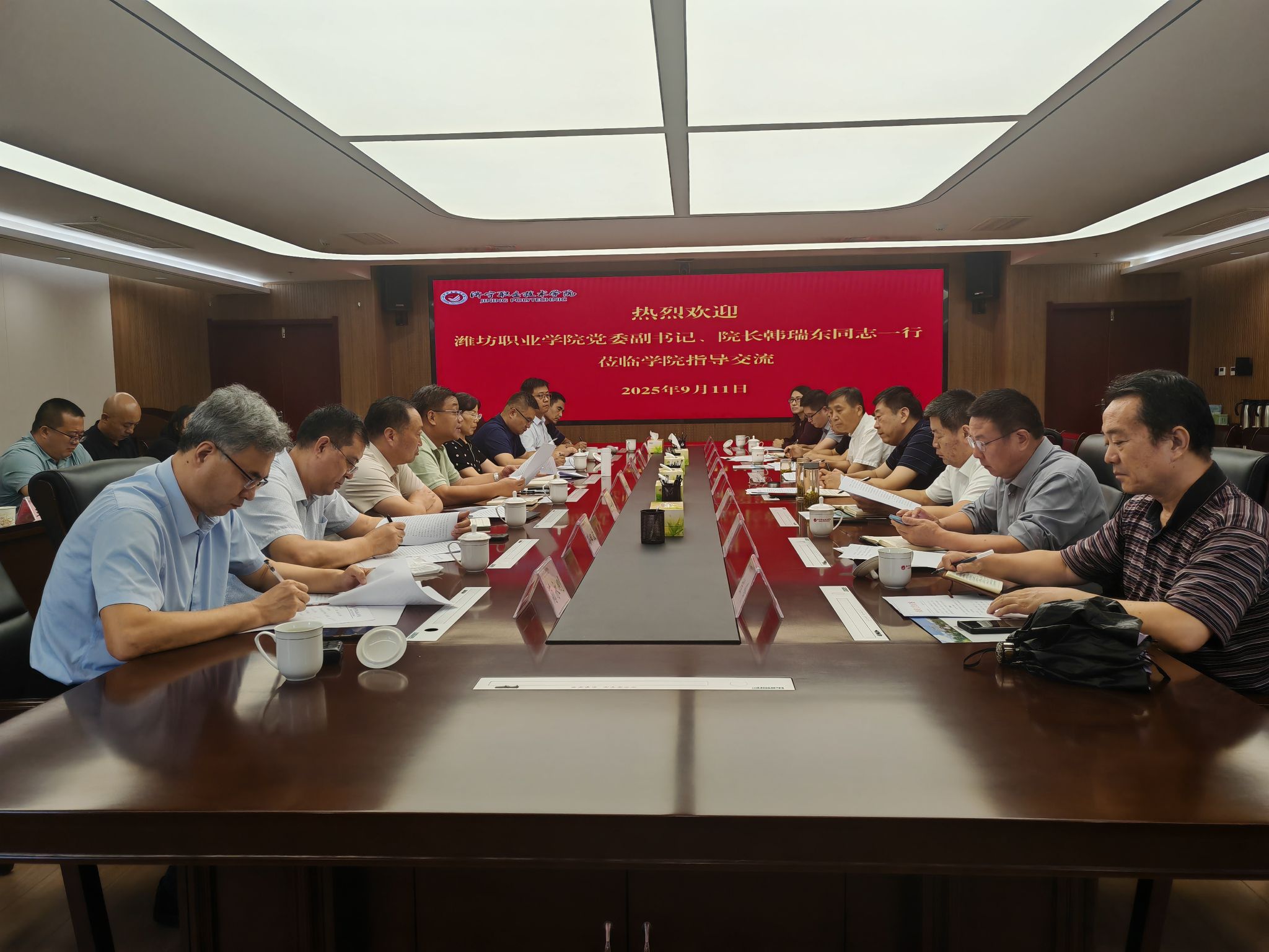 在山东理工职业学院,考察团在张隆海校长的陪同下,参观了知识产权实训大厅、非物质文化遗产中外人文交流中心、国际化办学展区、机电工程学院实训中心、汽车工程学院实训中心、工业技术博物馆及公共实训基地等场所,全面了解了该校在产教融合、国际化办学、智能制造及实训基地建设等方面的创新成果。随后,双方举行座谈会。张隆海介绍了学校的办学历史、学科建设、社会服务及国际化发展等情况。韩瑞东高度评价了近年来山东理工职业学院在各方面取得的成绩。双方围绕社会服务体系建设、人事制度改革、资产高效运营、后勤精细化管理等议题进行了深入交流。