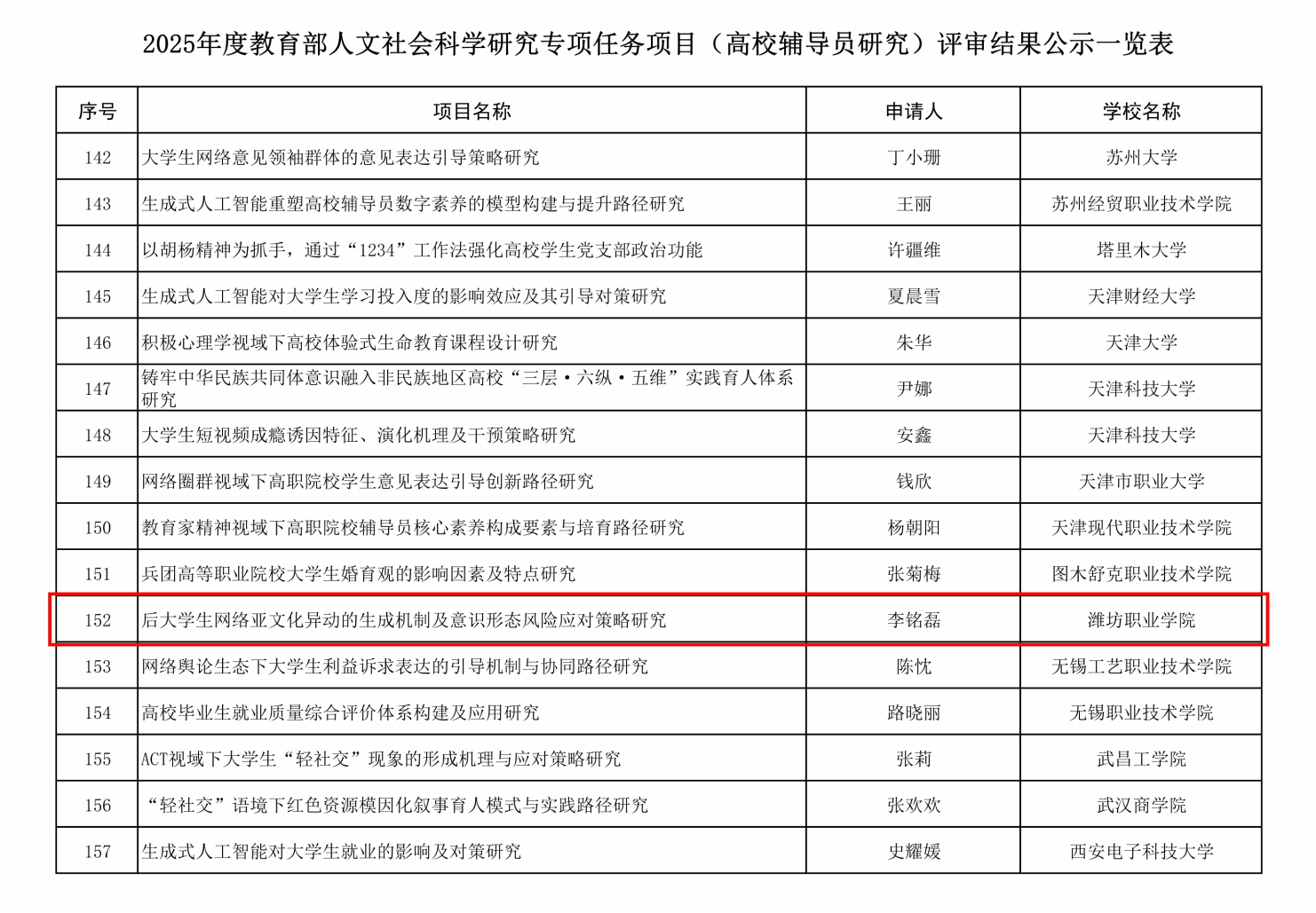 教育部人文社会科学研究项目是我国高校哲学社会科学领域具有高度权威性和重要影响力的科研项目,其立项情况不仅是衡量高校人文社科研究实力与创新能力的关键指标,也是推动高校科研工作服务国家战略需求、回应社会现实关切的重要载体。国际商务学院李铭磊团队申请的课题《00后大学生网络亚文化异动的生成机制及意识形态风险应对策略研究》入选高校辅导员研究专项拟立项名单。该课题以“00后”大学生为研究对象,直面网络亚文化的蓬勃发展及其伴随的意识形态风险这一现实挑战。研究融合马克思主义理论、文化学与社会学等多维视角,坚持理论逻辑、技术逻辑与实践逻辑的有机统一,系统剖析网络亚文化在“00后”群体中的生成机制,并致力于构建具有针对性的教育引导与风险防控策略。课题将首次构建“文化解码—价值重构—生态共建”三位一体的协同治理框架,并据此形成具象化的决策建议与资政报告,推动研究成果向政策实践的有效转化。