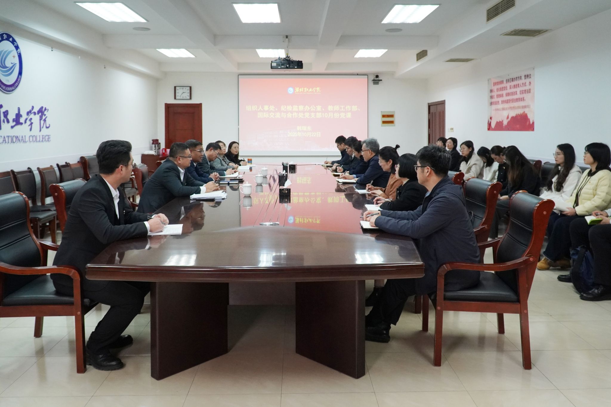 10月22日,学院组织人事处、纪检监察办公室、教师工作部、国际交流与合作处党支部联合开展主题党日活动,学院院长、党委副书记韩瑞东,党委委员、纪委书记、潍坊市监委驻76net必赢官网监察专员王国成参加相关活动并讲授“学习王伯祥先进事迹,为学院发展彰显担当作为”专题党课。党委委员、组织人事处(离退休工作处)处长于涛主持活动。四个党支部负责同志及党员干部20余人参加。