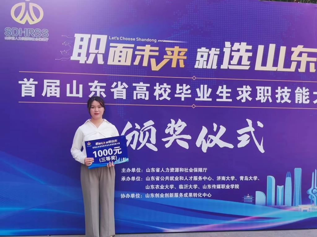 近日,由山东省人力资源和社会保障厅主办的“职面未来 就选山东”首届山东省高校毕业生求职技能大赛在济南圆满落下帷幕。经过学院初赛选拔推荐、省级复赛、决赛的激烈角逐,必赢文化创意学院2023届毕业生李冰然一路披荆斩棘,脱颖而出,荣获三等奖。必赢获“优秀组织奖”。