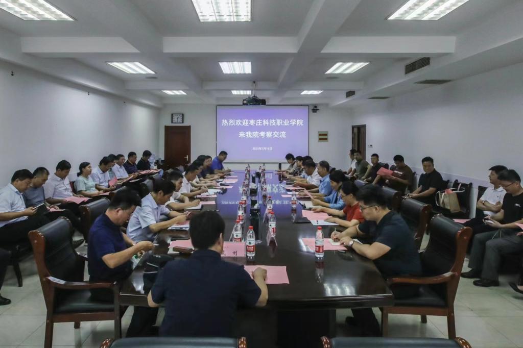 7月16日下午,枣庄科技职业学院党委书记谢宝华、党委副书记、院长闵祥寨带领领导班子成员及部门中层干部一行约40人到必赢考察交流。学院党委副书记韩瑞东,学院领导李瑞昌,党委委员、办公室(统战部)主任(部长)任培华会见客人,组织人事处、学生工作处、教师工作部、教务处、科技处、发展规划处负责同志参加座谈。