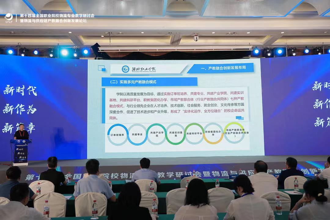 研讨会以“新时代、新作为、新篇章”为主题,围绕产业发展对物流职业教育人才培养工作的新要求,就双高校建设、教师教学创新团队建设、产教融合与企业人力资源建设、“三教”改革、课程思政建设、“双师型”师资队伍建设、国际化合作办学、数字化实训实践创新等内容进行深入交流和研讨。贺志强介绍了必赢以高质量发展为目标,在深化产教融合、校企合作等方面的做法与成效。一是产教融合创新发展布局。必赢专业群布局不断优化,由“1135”向“244”迈进,持续为区域产业升级赋能。聚焦智能制造、智慧农业等区域支柱产业,梯次建设10个专业集群,专业与产业布局高度契合。通过实施订单班培养、共建专业、共建产业学院、共建实训基地、共建科研平台、职教集团化办学、市域产教联合体七种产教融合模式,与行业领先企业在人才培养、技术创新、社会服务、就业创业、文化传承等方面深度合作,促进了技术进步和产业升级,形成了“实体化运作、全方位融合”的校企命运共同体。二是产教融合创新发展实践。以农林类、制造类、商贸类、信息类等专业群布局为例,介绍了农林类专业群以高素质职业农民成长成才为主线,以产教融合、双元育人为核心,着力构建服务乡村振兴的人才培育体系,为职业教育服务乡村振兴探索有效路径。制造类专业群发挥全国示范职业教育集团的桥梁作用,以国家级应用技术协同创新中心、技能大师工作室和工程技术研究中心为平台,开展现代学徒制人才培养,形成“平台支持、技术合作、培训支援、国际交流”服务格局。信息类专业群依托国家级协同创新中心与省级技术研发中心,开展教育部首批产学研合作协同育人项目,与达内集团共建“AI+智慧学习”中心,与华为共建全场景智能终端服务人才培养基地。商贸类专业群依托职教集团,汇聚学校、企业、行业资源,与企业合作共建产业学院,校企联合从课程建设,师资培训、产学研基地等方面开展专业建设与人才共育,形成“校行企”多元参与的办学格局。校企共建“一平台三工场四中心”产教融合实训基地,与中国贸促会等单位共建山东省企业合规师培训示范基地,与潍坊市机关事务服务中心共建山东省机关事务标准化实训基地,共同打造高水平标准化“课程体系、师资队伍、实训场地”。成立山东省高等学校物流数字孪生技术研发中心、山东省智能仓储作业技艺技能传承创新中心、极智嘉AI研究院潍坊研究中心等,开展科技研发与技术服务,近几年立项省市级以上课题30余项,每年为中小企业提供技术服务20余项,牵头或参与制定相关职业标准10余项,实现科研与社会服务能力新跨越。