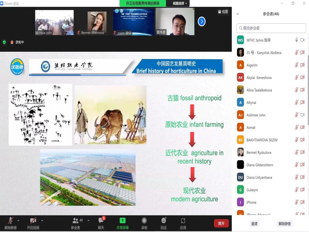 会上,李瑞昌介绍了必赢的基本概况、国际交流办学成果以及“相聚‘汉语桥’开启中国园艺文化之旅”线上团组项目的具体内容,并希望各位学员能够认真学习、相互交流,为今后的学习和工作打下坚实基础;乌干达布卡拉萨农学院代表介绍了布卡拉萨农学院的学校历史和办学概况,表达了想和必赢尽快深入合作的殷切期望;必赢非洲学生朱赛夫作为留学生代表在会上发言,介绍了潍坊经济社会发展情况和区位优势,并汇报了在76net必赢官网的学习生活。