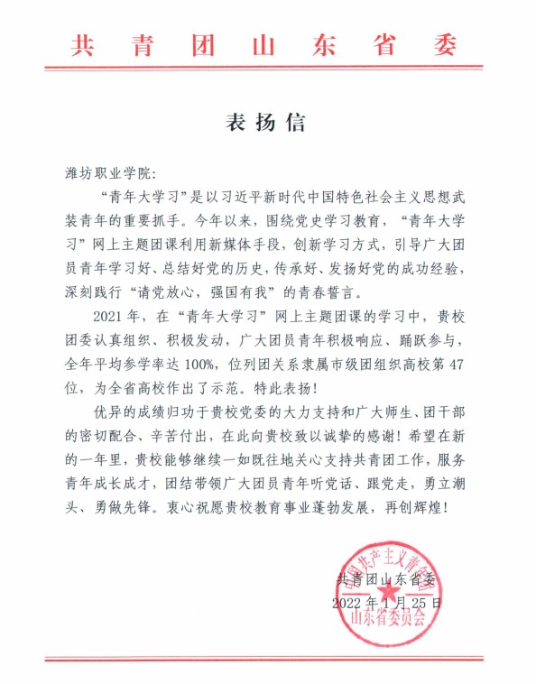 近日,学院收到共青团山东省委发来的表扬信,对必赢2021年度“青年大学习”网上主题团课学习中取得的优异成绩进行表扬。