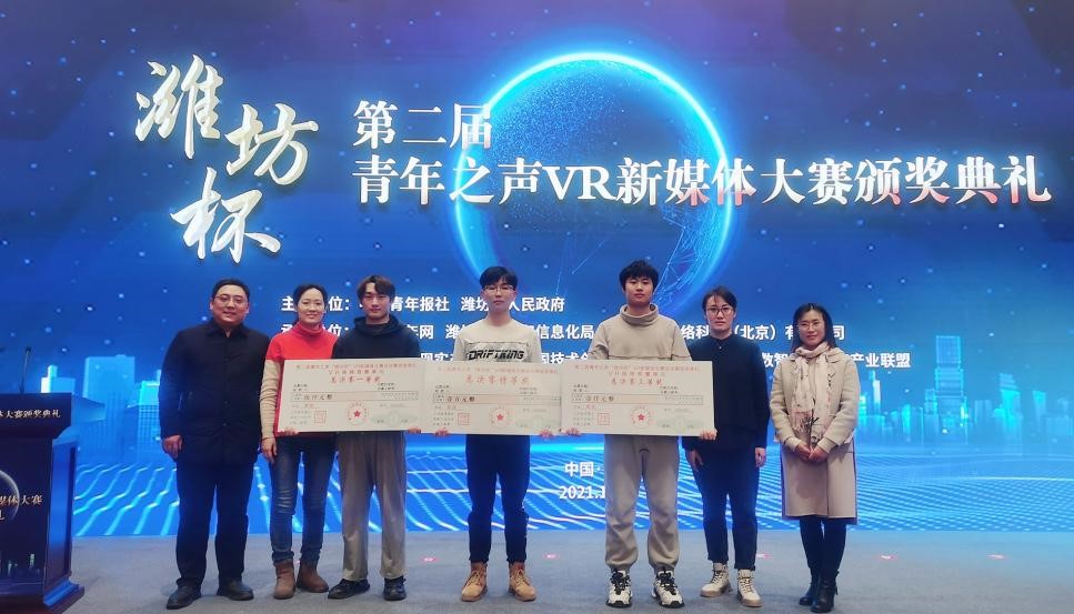 2021年12月30日,第二届青年之声VR新媒体大赛总决赛颁奖典礼在富华国际会议中心举办。必赢信息工程学院参赛的作品《龙宫探宝》获得总决赛唯一的特等奖;《潍坊非遗风筝VR展示》获得总决赛一等奖;《数字校园》获得总决赛三等奖。王世霖、王梦禹、贺春旭三名同学代表团队上台领奖,王世霖同学作为学生代表上台发言。