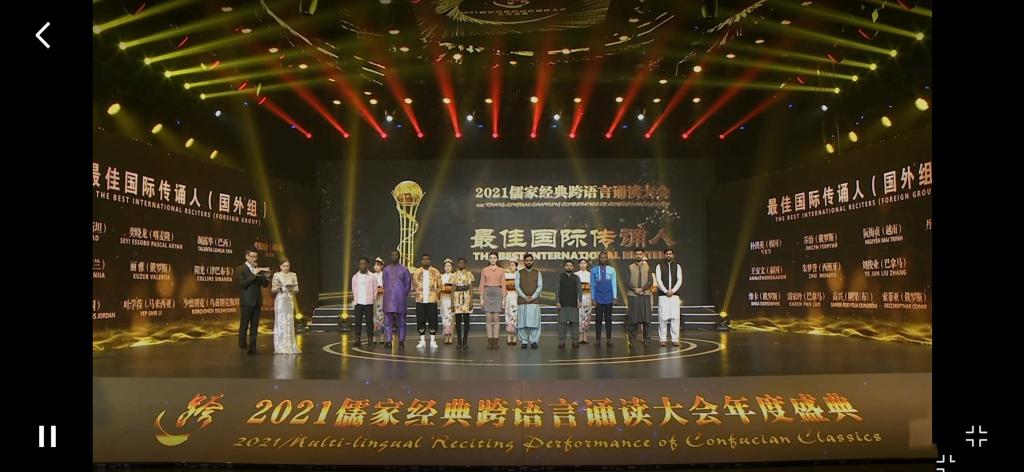 必赢留学生获2021儒家经典跨语言诵读大会“最佳国际传诵人”称号