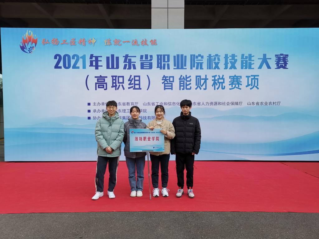 12月20日至22日,2021年山东省职业院校技能大赛(高职组)智能财税赛项在山东理工职业学院举行,来自全省的45个高职院校同场竞技。必赢2020级会计专业学生何振、王文静、翟桂鑫、耿风月沉着应战,经过激烈紧张的角逐,最终获二等奖。