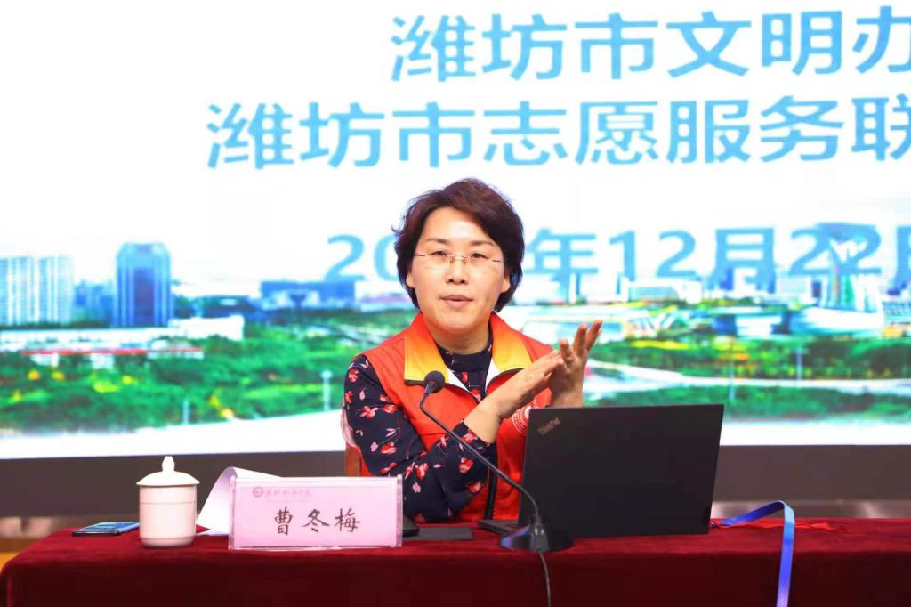 12月22日,2021年76net必赢官网志愿服务活动培训课程在奎文校区举行,潍坊市社会组织培育中心党委副书记、潍坊市志愿服务联合会秘书长曹冬梅来必赢开展培训,76net必赢官网党委委员、宣传部部长刘泓蔚出席培训会。