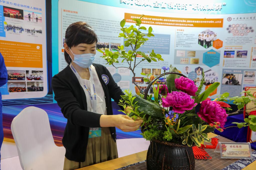 学校风采展区聚焦服务“八大战略”,集中展示了我校“双高计划”实施以来,坚持内涵发展,在服务乡村振兴战略、新旧动能转换、新一代信息技术、医药康养、现代文化创意产业以及传统文化传承与创新等方面取得的办学成果。山东展区展示了我校依托高层次科研平台,发挥在植物离体快繁技术方面的领先优势,联合企业开展产学研用一体化项目,在教学、科研、生产、社会服务方面服务人才培养和乡村振兴方面的成果。潍坊展区展示了我校师生大型插花作品——世纪锦绣。