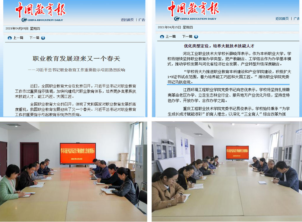 4月15日,学校组织全校教职员工对习近平总书记在全国职业教育大会上的重要指示、李克强总理的重要批示和全国职业教育大会精神进行集体学习,并结合学校的十四五规划、双高建设任务以及部门的具体工作开展学习、交流和讨论。