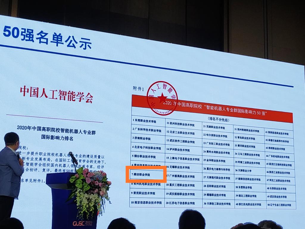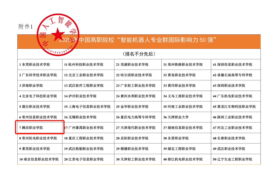 中国高职院校“智能机器人专业群国际影响力”50强榜单由3个一级指标、11个二级指标组成,在国际工程教育学会的支持下,由中国人工智能学会组织国内机器人领域权威专家,对全国1430余所高职院校进行了初评、复评,最终50所高职院校成功入选。