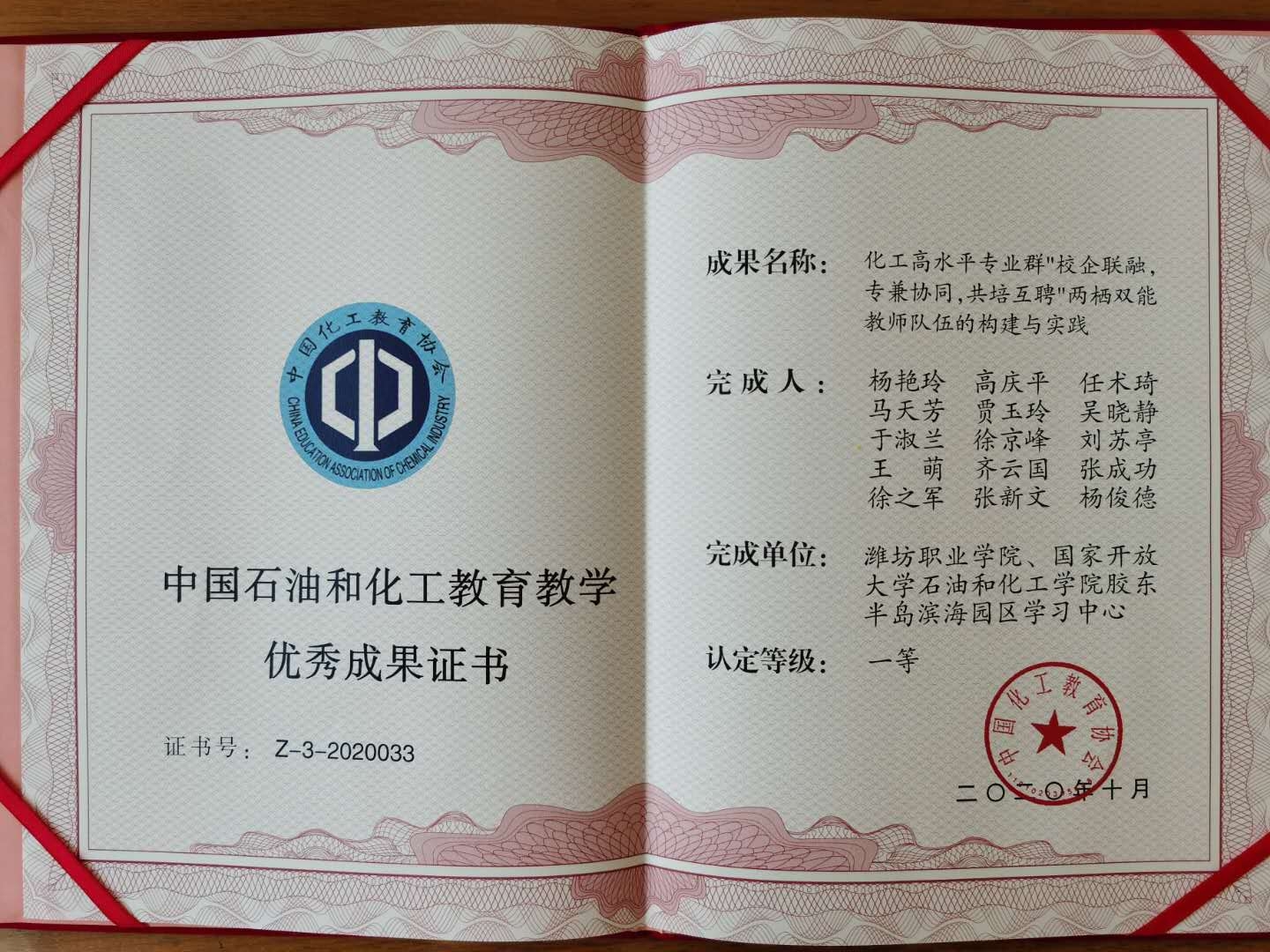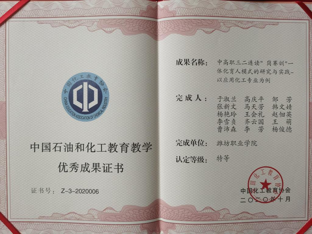 中国化工教育年会宣读了第五届中国石油和化工教育教学成果的认定结果,并向优秀成果获奖者代表颁发了荣誉证书。中国石油和化工教育教学成果每4年评定一次,本届参评成果400余件,按不超过申报总数的5%、15%、30%比例评选出优秀本科教学成果66项、论文31篇,优秀职教教学成果88项、论文39篇,其中特等奖仅16项(本科7项、高职9项)。必赢喜获优秀教学成果4项,其中山东省教育教学于淑兰名师工作室核心成员主研的《中高职三二连读“岗赛训”一体化育人模式研究与实践》、《化工高水平专业群“校企联融,专兼协同,共培互聘”两栖双能教师队伍的构建与实践》,《“双元四段,精准育人”化工现代学徒制人才培养模式构建与实践》依次荣获特等奖、一等奖、二等奖。