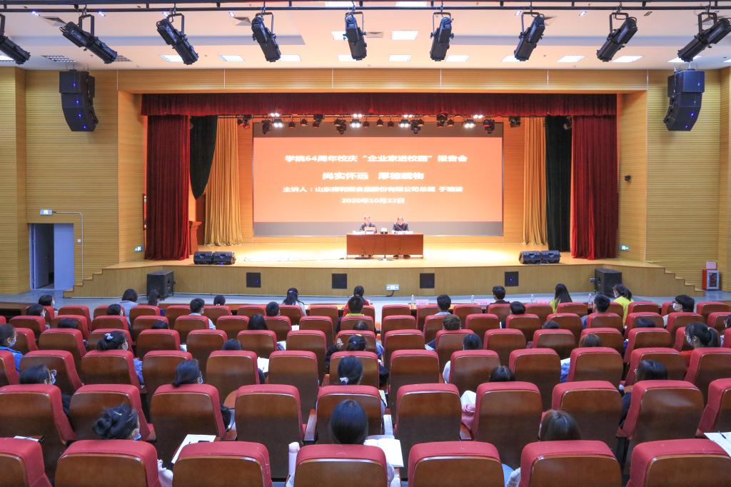 10月22日下午,学院64周年校庆“企业家进校园”活动报告会在滨海校区图书馆报告厅举行。山东得利斯食品股份限公司总裁于瑞波作了题为“尚实怀远,厚德载物”的报告。学院党委副书记宋桂言出席并主持报告会,科技处(产学研合作中心)、食品药品学院负责人、师生代表240余人参加了报告会。