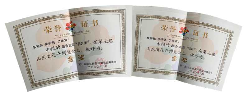 近日,由中国花卉协会盆栽植物分会、山东省林木种苗协会主办,青州市花卉协会承办的第七届山东省花卉博览会在青州举办,期间同步举办组合盆栽比赛项目。必赢雒新艳、李常英、丁美丽三位老师的作品《融》和《花月夜》荣获此次赛事最高奖——金奖。