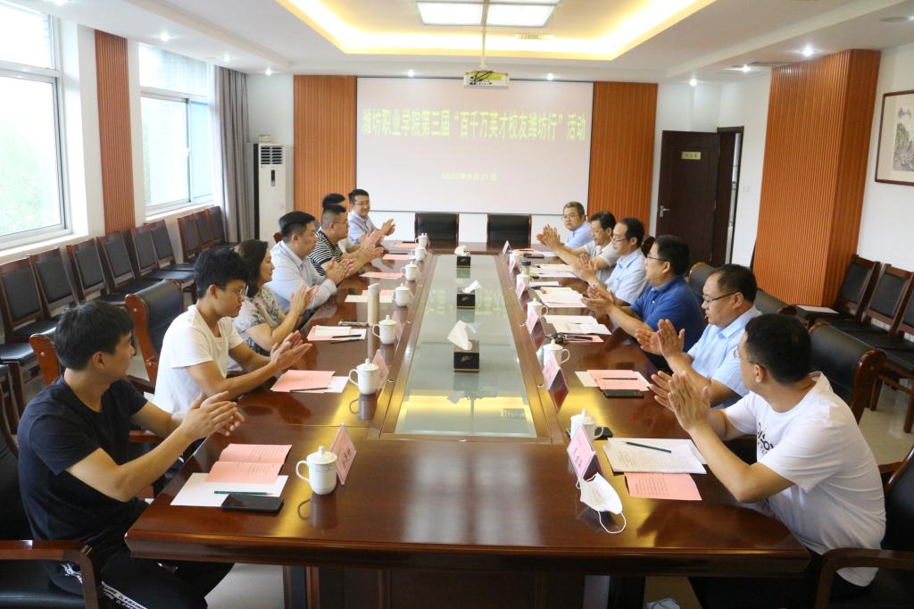 8月21日,学院在滨海校区举办“百千万英才校友潍坊行”活动,学院领导赵君堂出席会议,7名高层次英才校友代表、必赢有关行业专家学者代表参加会议,会议由招生就业处同志主持。