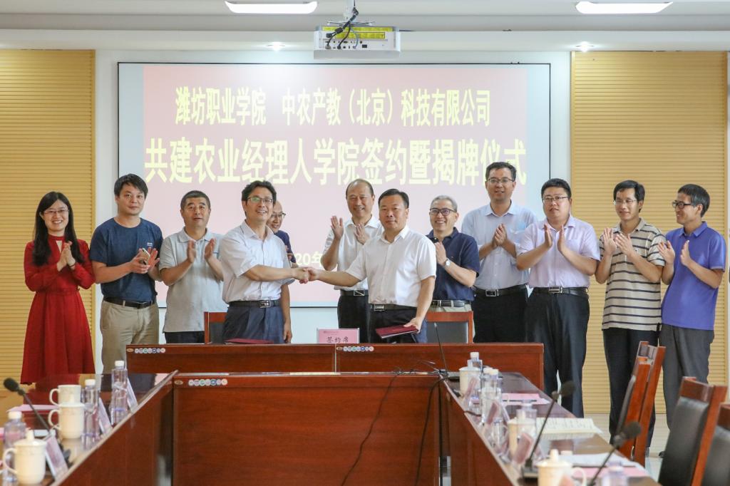 6月10日下午,学院与中农产教(北京)科技有限公司共建农业经理人学院签约暨揭牌仪式在滨海校区清泽楼会议室举行。学院党委书记马跃启、副院长贺志强,农业农村部人力资源开发中心副主任吴金玉,农业农村部人力资源开发中心职业技能鉴定处处长何兵存,中农产教(北京)科技有限公司总经理、中信农业科技股份公司总经理助理、中国农业经理人发展联盟副会长、秘书长纪绍勤,中农产教(北京)科技有限公司潍坊运营中心负责人、中国农业经理人发展联盟副秘书长于克勇以及学院科技处(产学研合作中心)、教务处、招生就业处、继续教育学院、农林科技学院等主要负责同志参加仪式。