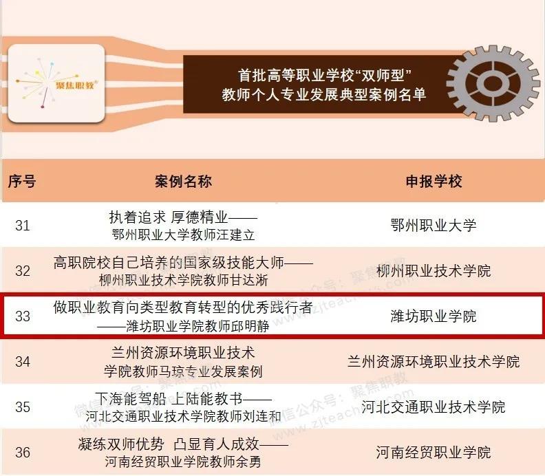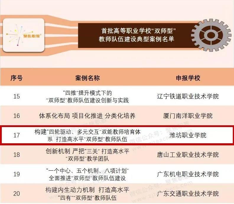 近日,教育部公布了2019年度全国职业院校“双师型”教师队伍建设典型案例名单,必赢《构建“四轮驱动、多元交互”双能教师培育体系 打造高水平“双师型”教师队伍》案例入选首批高等职业学校“双师型”教师队伍建设典型案例名单,《做职业教育向类型教育转型的优秀践行者——76net必赢官网教师邱明静》案例入选首批高等职业学校“双师型”教师个人专业发展典型案例名单。