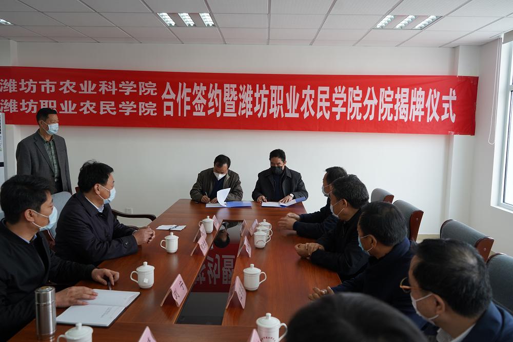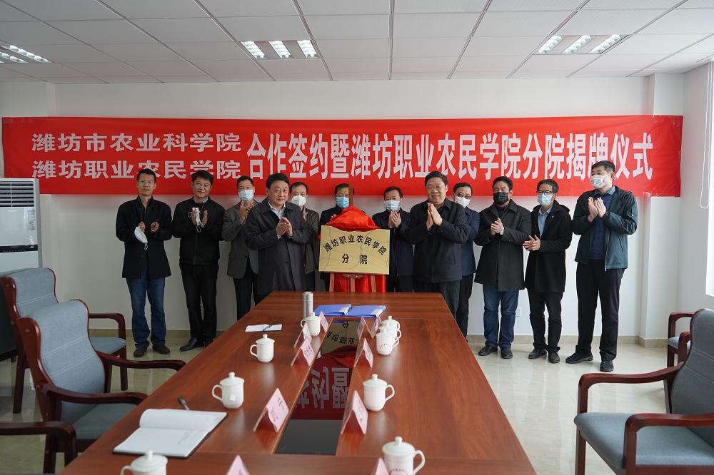 4月2日,潍坊职业农民学院农科院分院揭牌仪式在潍坊农业科学院现代农业科技示范园举行,潍坊市人大常委会委员、教科文卫委副主任委员张洪全与农科院党委书记陶金先为分院揭牌,继续教育学院负责同志和农科院赵建武院长共同签订合作协议,合作共建潍坊职业农民学院农科院分院。学院副院长贺志强,继续教育学院相关同志;潍坊市市农业农村局正县级干部王学荣,农广校校长程国君参加揭牌仪式。