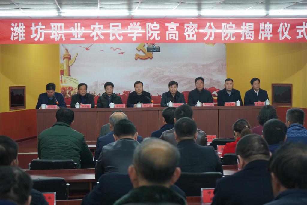 高密市副市长付联宝在讲话中表示,高密市委、市政府将集聚优势资源,全力支持潍坊职业农民学院在高密开展科研、教学、培训等各项活动,全力承接潍坊职业农民学院的技术转移和培训项目。高密全市各部门要充分发挥职能作用,为双方深化合作提供优质服务,为加快推动高密农业农村发展转型升级提供更加有力的人才支撑和智力支持。