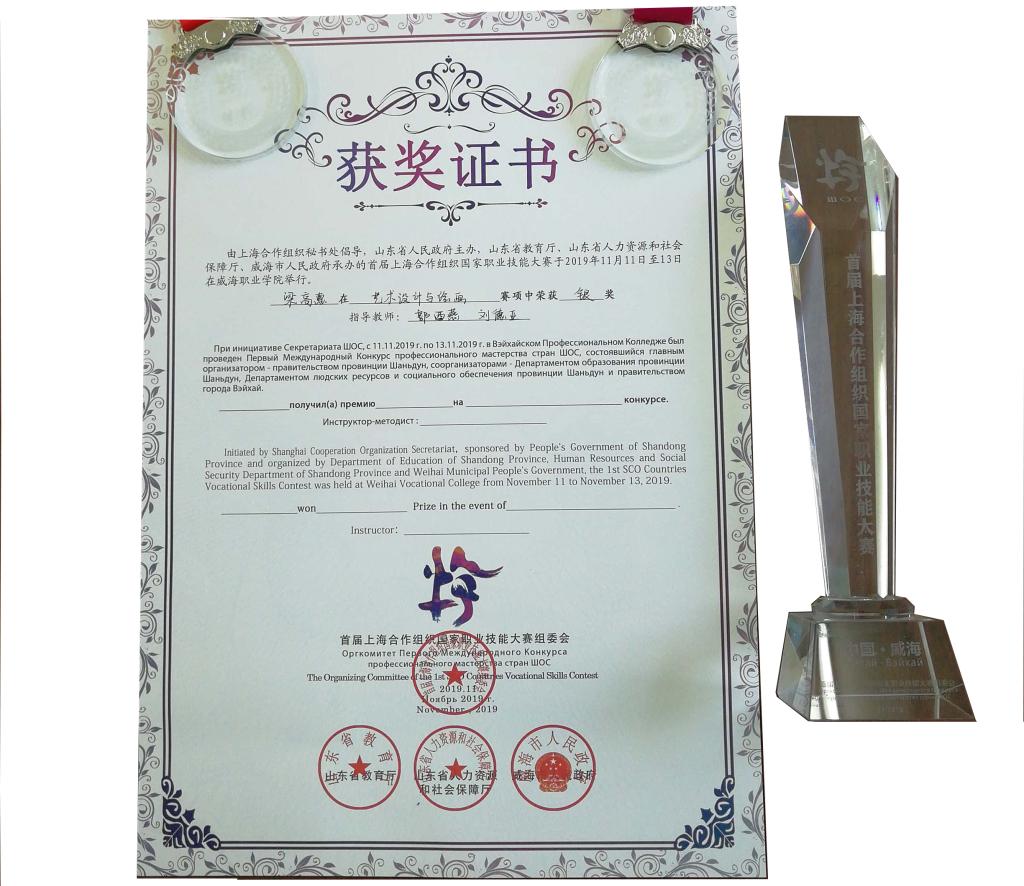 11月11日,以“增进友谊、展示技能、共赢发展”为主题的首届上海合作组织国家职业技能邀请赛在威海职业学院开赛。经过层层选拔、评选,必赢文化创意学院教师郭西燕、刘德亚指导的梁高惠同学的作品在艺术设计与绘画项目比赛中获得银奖。