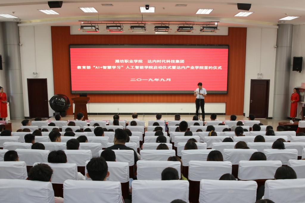 9月6日,教育部“AI+智慧学习”共建人工智能学院启动仪式暨达内产业学院签约仪式在清泽楼报告厅举行。学院党委书记马跃启,副院长贺志强、刘德强,达内时代科技集团副总裁郭陟,AI项目部总经理谢远庆,院校事业部北方区总经理侯增辉、副总经理杨泽辉,AI项目部大客户总监赵飞鹏,山东大学生实训基地总经理徐勇等学院和公司领导出席,产学研合作中心、信息工程学院、经营管理学院负责同志和师生代表共计300余人参加活动。刘德强主持仪式。