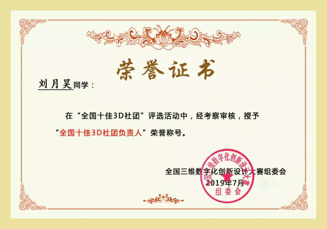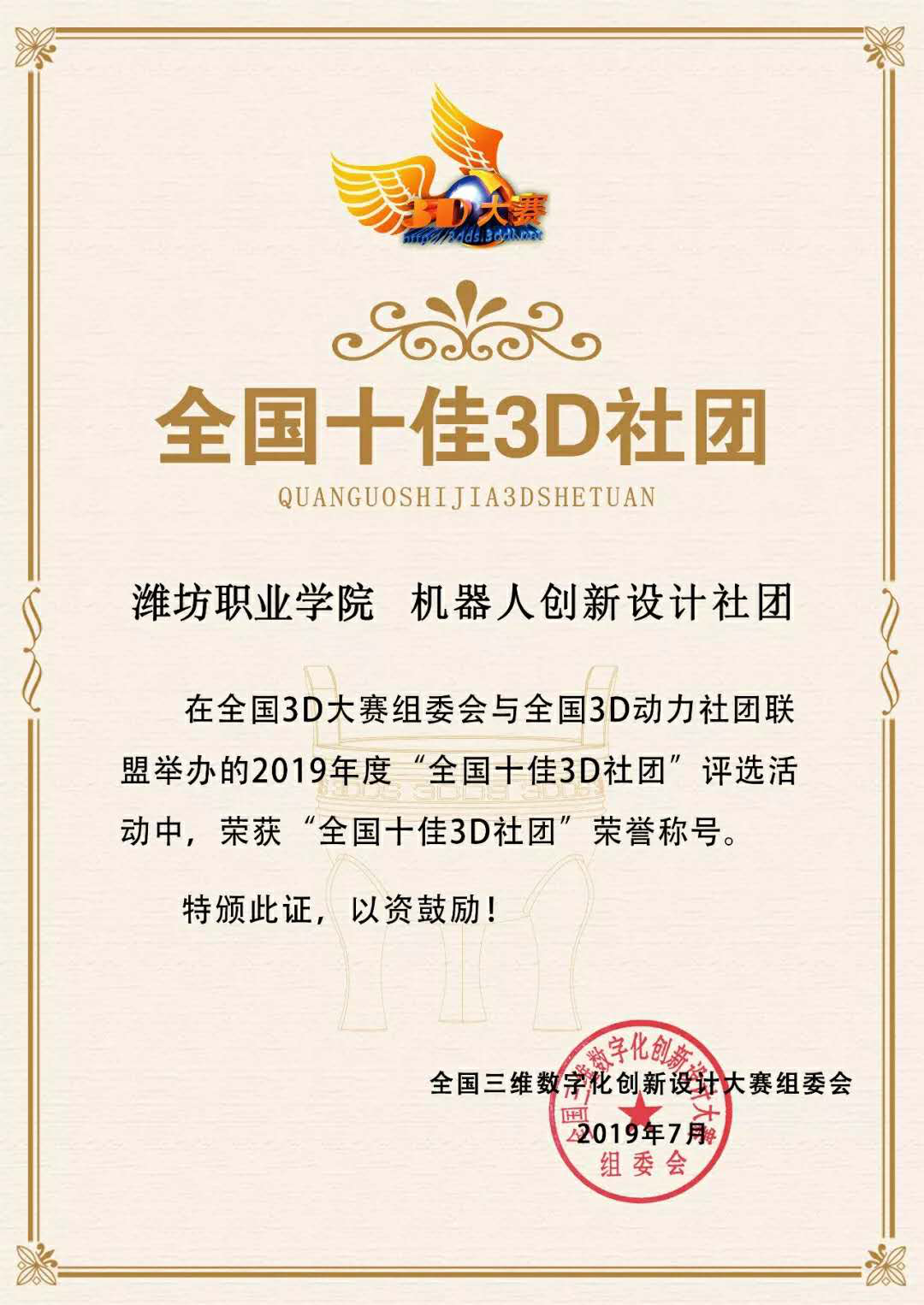 近日,由全国三维数字化创新设计大赛组委会举办的“全国3D动力社团联盟2019十佳社团评选”活动中,必赢机器人创新设计社团荣获“全国十佳3D社团”荣誉称号,社长刘月昊同学获得“全国十佳3D社团负责人”荣誉称号。