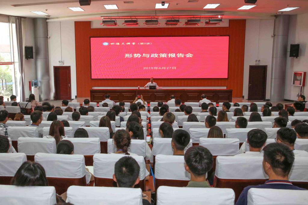 6月27日下午,学院在清泽楼报告厅举办“明德大讲堂”第二讲,学院党委书记马跃启为师生作形势与政策报告。学院党委副书记宋桂言,副院长贺志强,纪委书记郭晓辉,副院长谭明出席。学院有关部门负责同志、二级学院党支部书记,以及二级学院团总支书记、辅导员代表,思政课教师代表,青年教师代表,学院“青年马克思主义者培养工程”培训班学生代表300余人聆听报告。