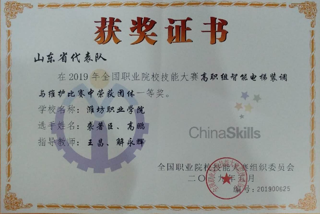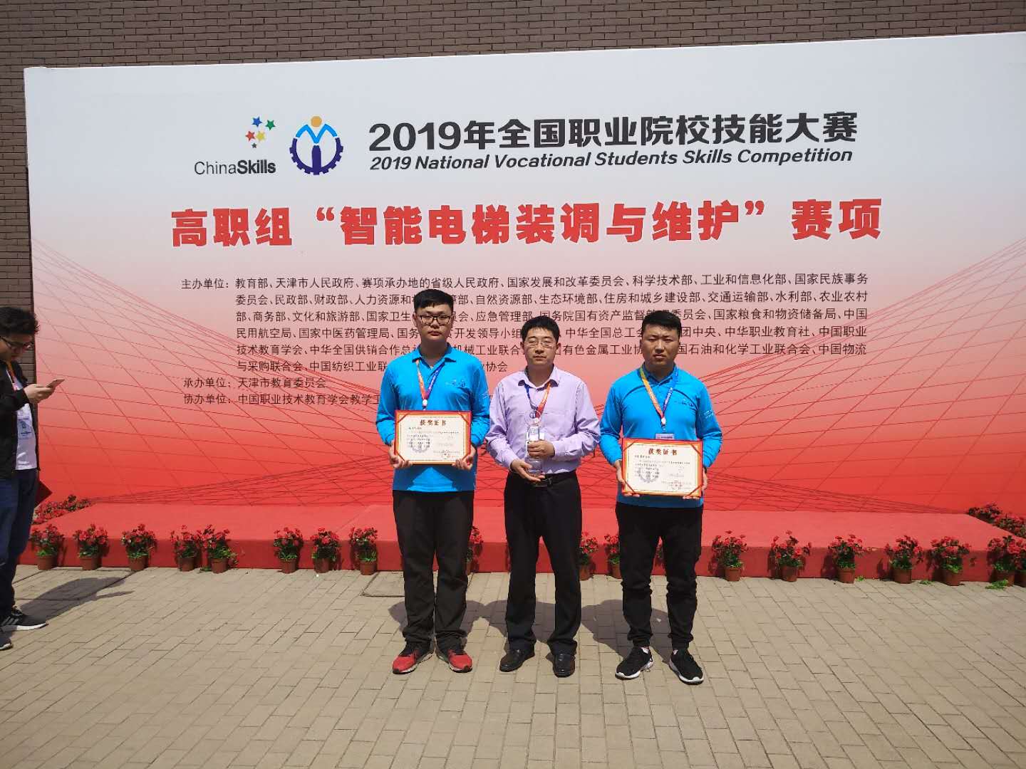 5月6日至8日,2019年全国职业院校技能大赛高职组“智能电梯装调与维护”赛项在天津轻工职业技术学院举行,来自全国的90支代表队参赛。必赢机电工程学院选派2017级电梯工程技术班学生袭著臣、高鹏,指导教师王昌、程义民、解永辉组成的山东三队参加比赛并获得团体一等奖,这是必赢连续五届获得该赛项国赛一等奖。