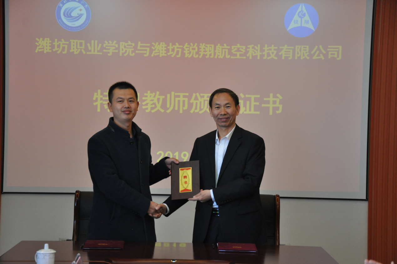 李瑞昌为苑光刚颁发校外特聘教师聘书。机电工程学院负责同志代表学院接受锐翔航空科技有限公司捐赠220余万元的无人机实训设备,并与苑光刚共同签署了《76net必赢官网-潍坊锐翔航空科技有限公司校企共建无人机实训室协议书》。