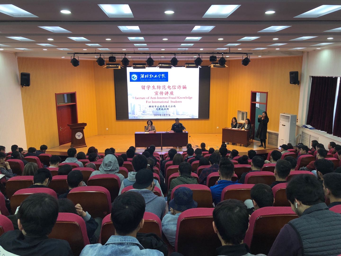 3月27日下午,潍坊市公安局奎文分局公共关系中心马金国主任及奎文出入境、大虞派出所民警一行6人,在奎文校区报告厅作防范网络诈骗安全知识讲座。国际交流与合作处负责同志、留学生管理教师及160余名留学生参加讲座。
