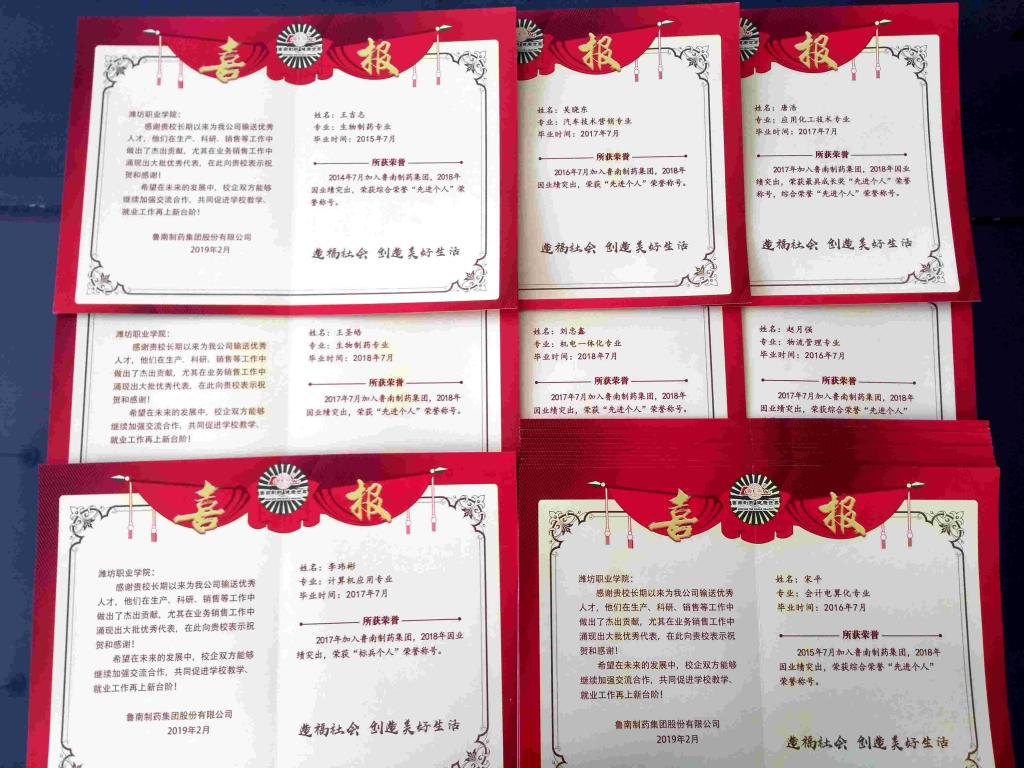 3月21日,鲁南制药集团股份有限公司专门派人到我校送来喜报,感谢我校长期以来为该公司输送优秀人才。我校毕业生在生产、科研、销售等工作中为企业做出了杰出贡献, 2018年王吉志等20名毕业生荣获年度综合荣誉“先进个人”称号,公司负责人高度赞扬了必赢毕业生过硬的专业技能和饱满的工作态度,并对必赢的就业工作给予了高度评价,希望校企双方能够进一步加强交流合作,共同促进学校教学、就业工作再上新台阶。