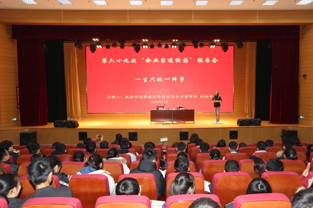 11月20日上午,学院第六十九次“企业家进校园”活动报告会在图书馆楼报告厅举行。威海市园林建设集团有限公司董事长戚海峰作了题为“一生只做一件事”的报告。科技处(产学研合作中心)相关人员和农林科技学院300余名师生参加报告会。