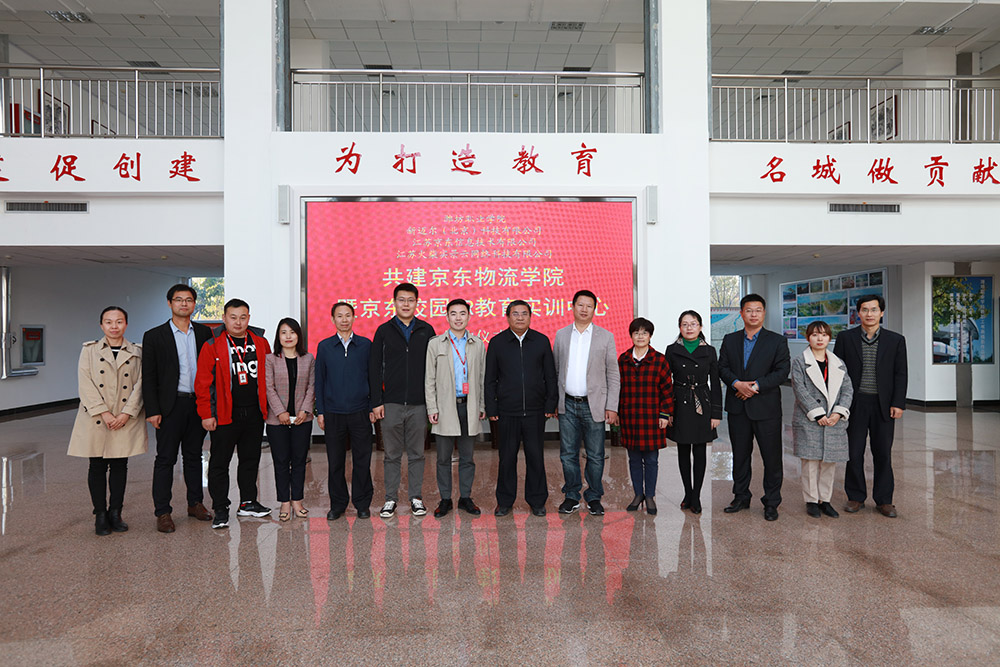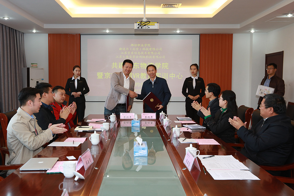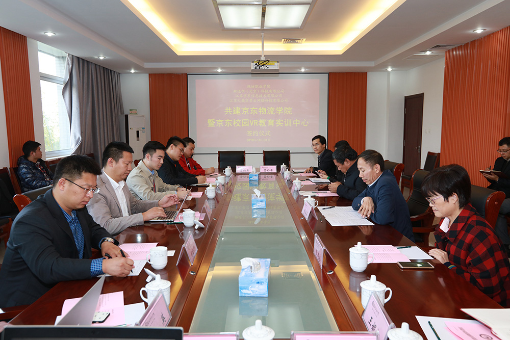 为加快发展现代职业教育,落实技能型管理人才培养与就业对接,实现学校、企业和学生多方发展共赢,10月31日,学院与新迈尔(北京)科技有限公司、江苏京东物流信息技术有限公司、江苏火柴实景云网络科技有限公司共建京东物流学院暨京东校园VR教育实训中心项目的签约仪式在清泽楼222会议室举行。院长王家爱,副院长李瑞昌出席了签约仪式,教务处、科技处以及经营管理学院相关负责同志和物流专业骨干教师参加。