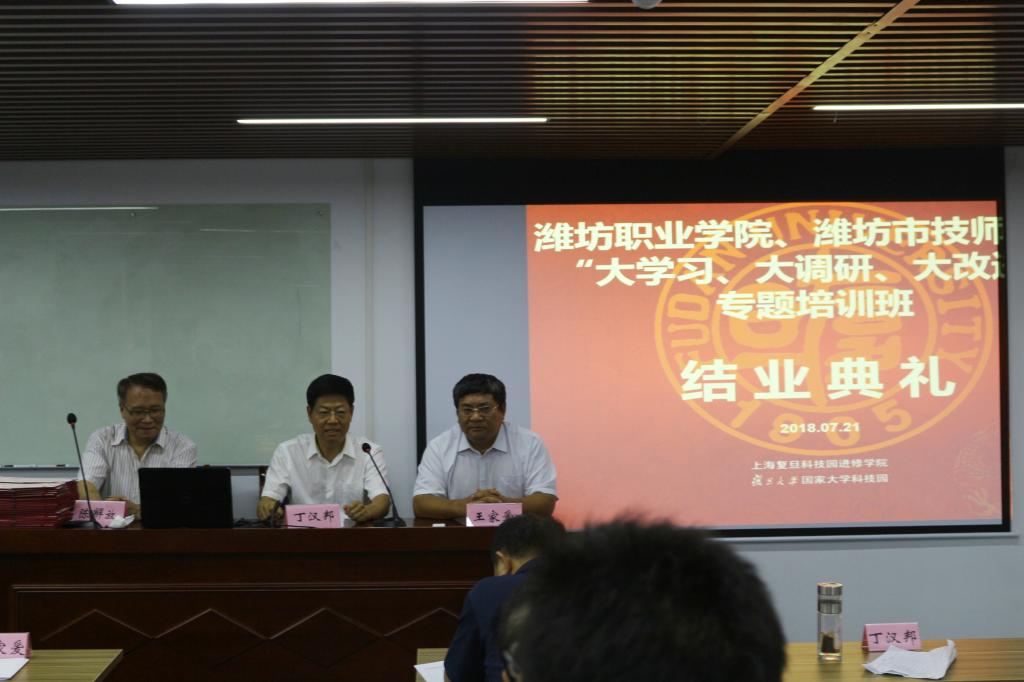 在结业典礼上,陈解放为两个学院的学员代表颁发了结业证书。潍坊市技师学院院长丁汉邦作了总结讲话,他对复旦大学科技进修学院表示了感谢,并对本次培训活动作了高度评价。他指出,本次培训班,开创了潍坊市两个学院联合开展领导干部集训的先河,不仅收获了先进的职教理念和知识,也接受了上海城市文化及复旦大学校园文化的熏陶,更是按受了一次鲜活的党性教育和心灵洗礼,同时,本次培训班,进一步加深了76net必赢官网和潍坊市技师学院的友谊,为今后两个学院的深度合作和建设发展奠定了良好基础。(邢同胜供稿)